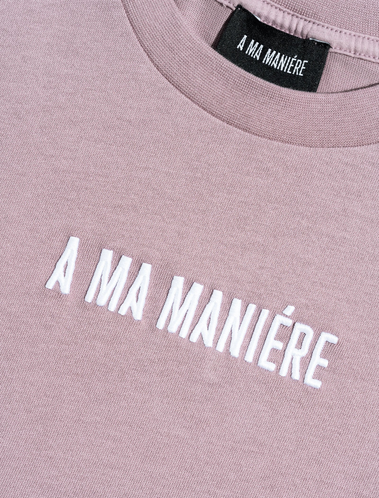 The KIDS BAR LOGO T-SHIRT is a light purple cotton shirt featuring "A MA MANIÈRE" in a white bar logo on the front center, shown against a plain light gray background.