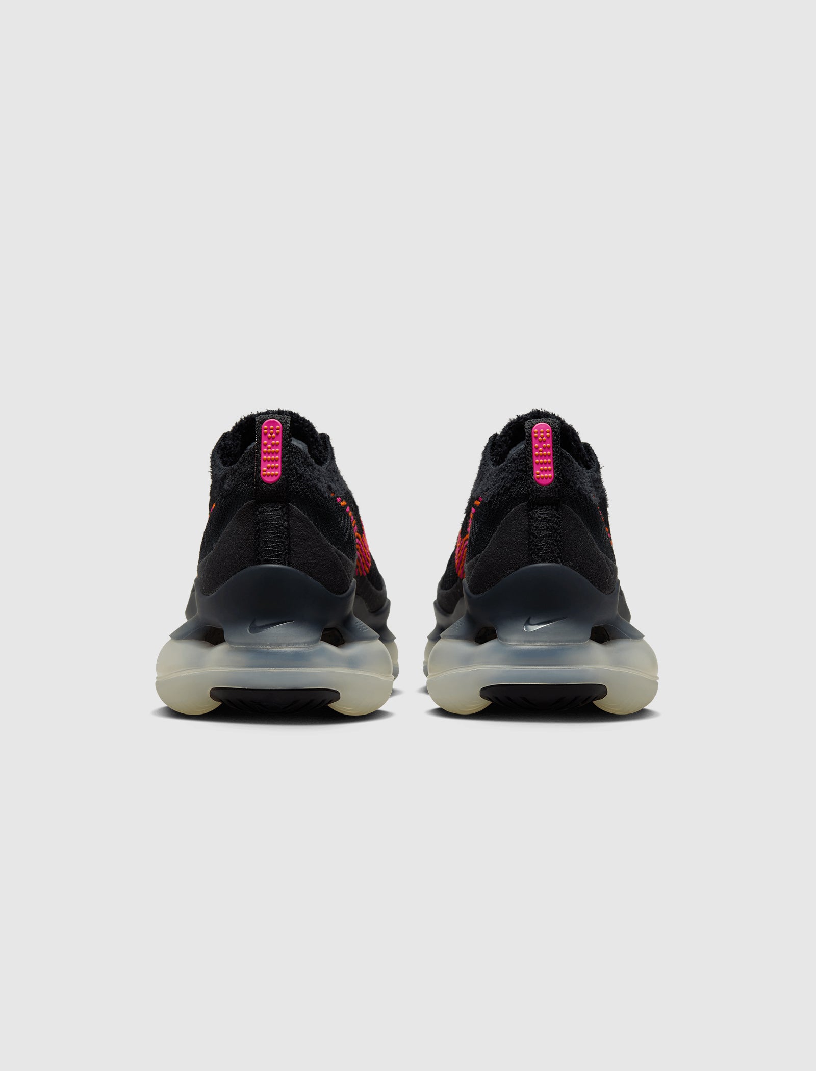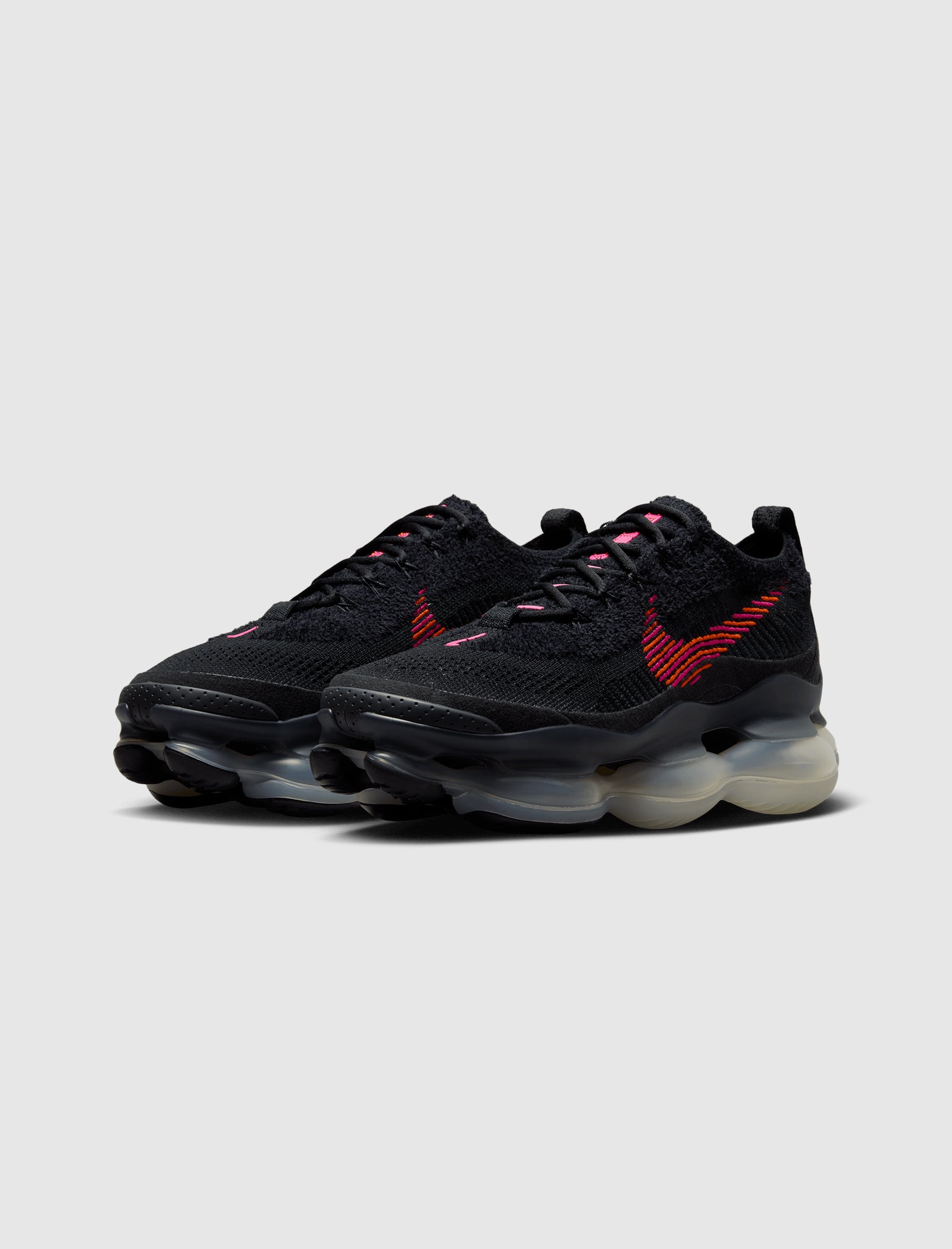Low top sneakers. Chenille blend flyknit upper. Logo emblem at the toe. Embroidered logos on the side panels. Front lacing. Polyester textile overlays around the toe, lower side panels, and heel counter. Large bulbous air max cushioning at the midsole. Separated rubber outsole.