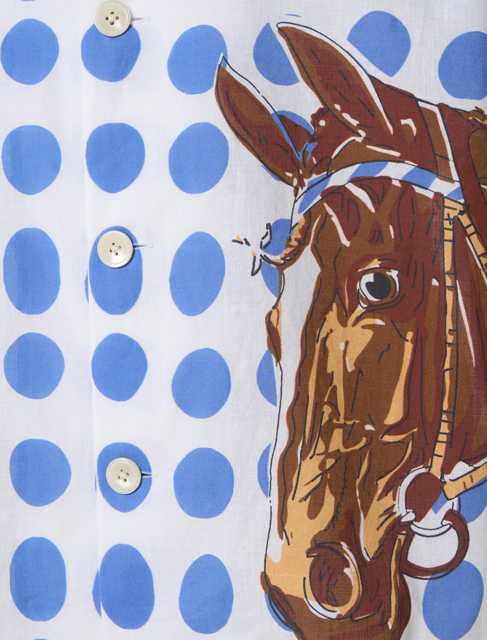 This Bode shirt replicates a vintage design, featuring a classic print of blue-and-white dots and a horse illustration from the 1950s. Crafted with crisp cotton voile, this shirt exudes timeless elegance and charm.