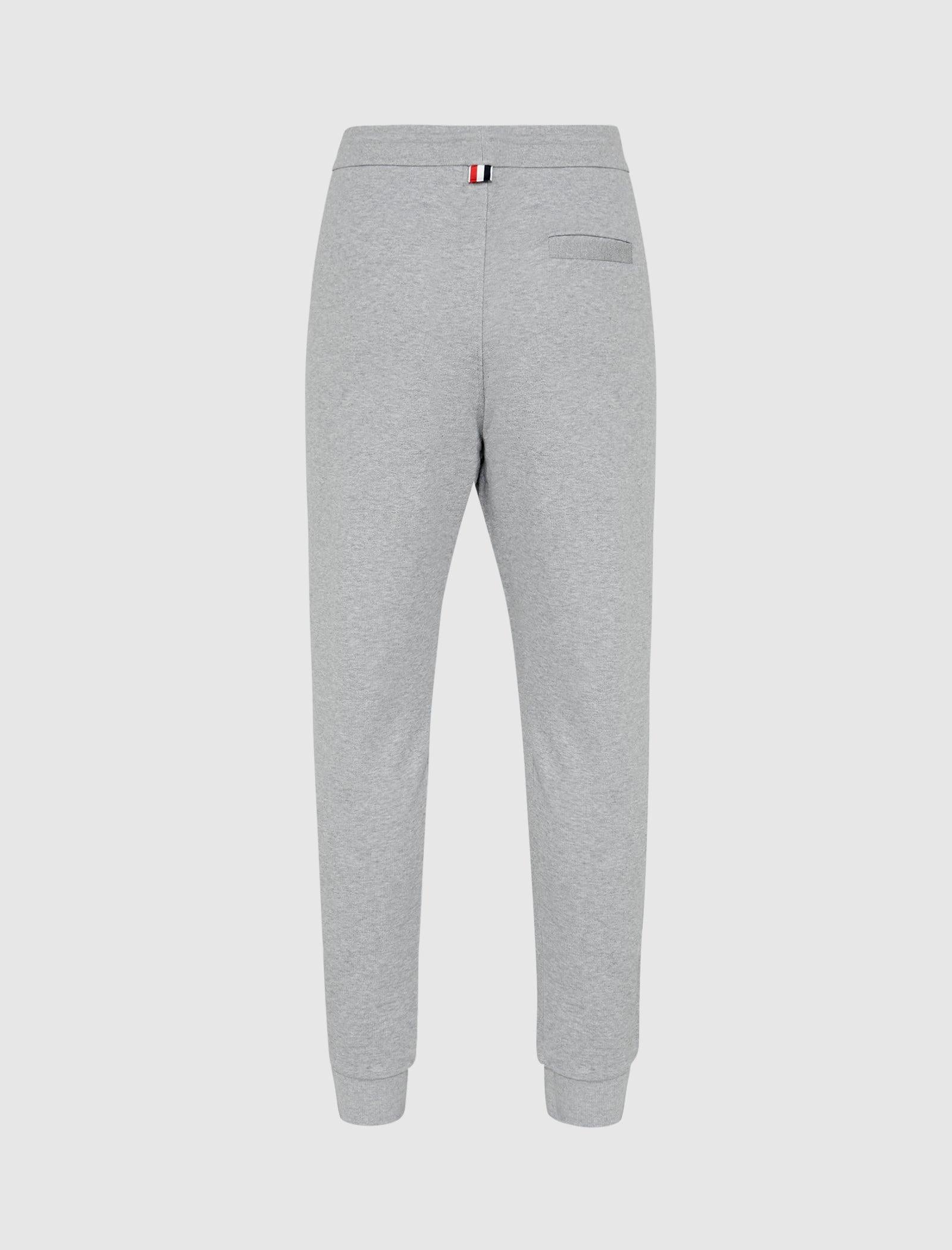 The CONTRAST STITCH SWEATPANT is a light gray classic-fit cotton sweatpant with an elastic waistband, drawstring, cuffed ankles, and a patch detail on the left thigh. Simple design shown on a plain white background.A person wears CONTRAST STITCH SWEATPANT in light gray cotton, a matching gray T-shirt, and gray-and-white sneakers, standing facing forward. Only their body from shoulders down is shown against a plain light background.