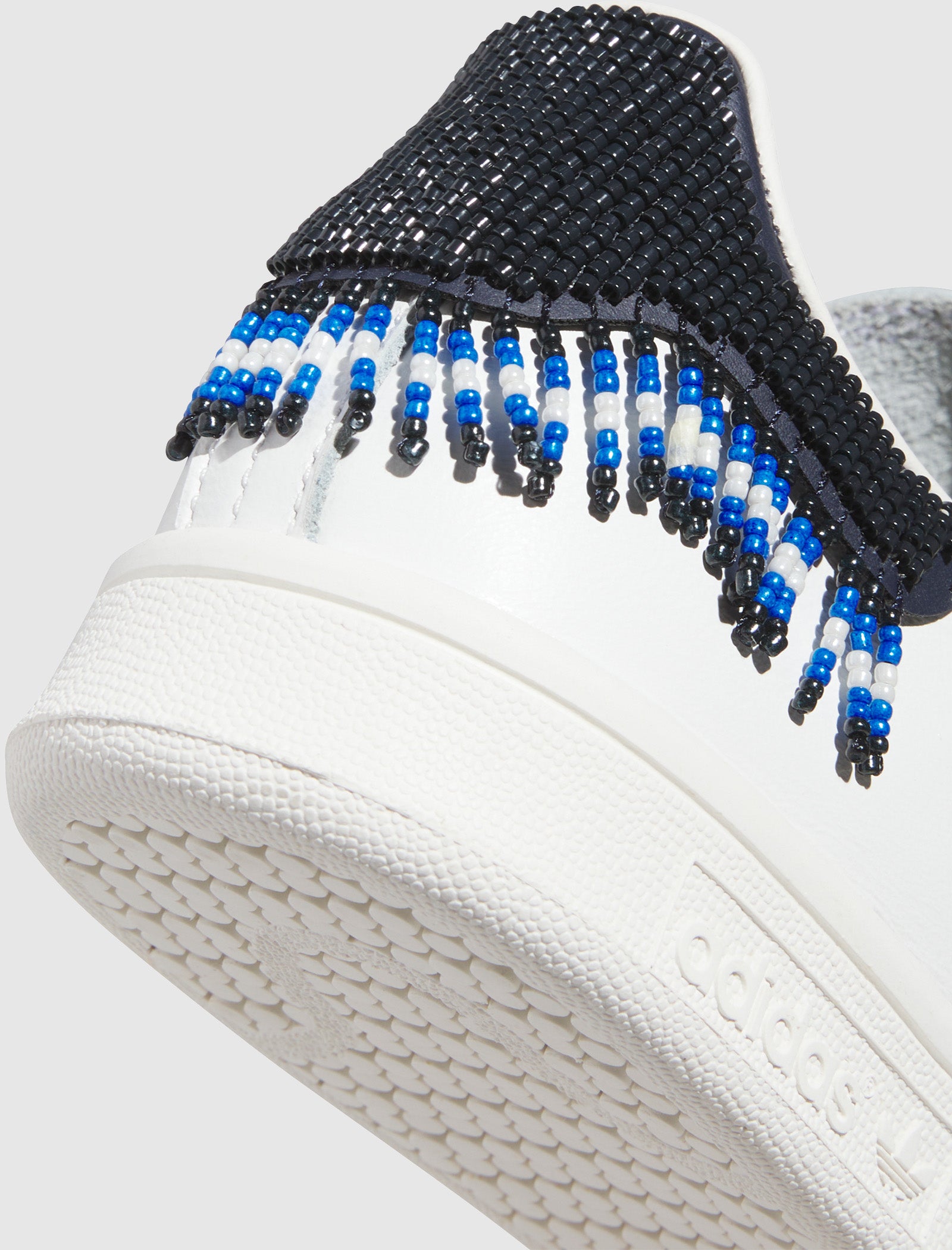 Low top sneakers. Leather upper. Round toe. Perforated stripe motif on the side panels. Padded leather tongue. Front lacing. Beaded accent overlay on the back of the collar with hanging beaded tassels. Rubber midsole. Rubber outsole.